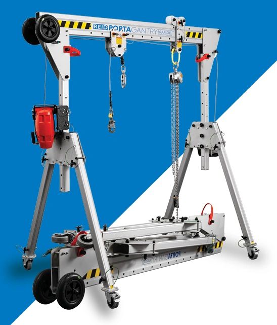 PORTA GANTRY RAPIDE is a height-adjustable, foldable aluminum gantry crane designed for rapid deployment and is fully portable. Capable of an impressive load lifting capacity of up to 2200lb.